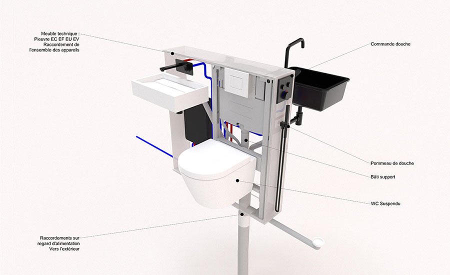 Le meuble technique est doté d’un composant technique compact standardisé regroupant l’ensemble du réseau plomberie et ses raccordements vers les différents apareillages : distribution EC/EF, EU/EV, raccordement évier, vasque, WC, ECS instantané, colonne de douche, puisage.